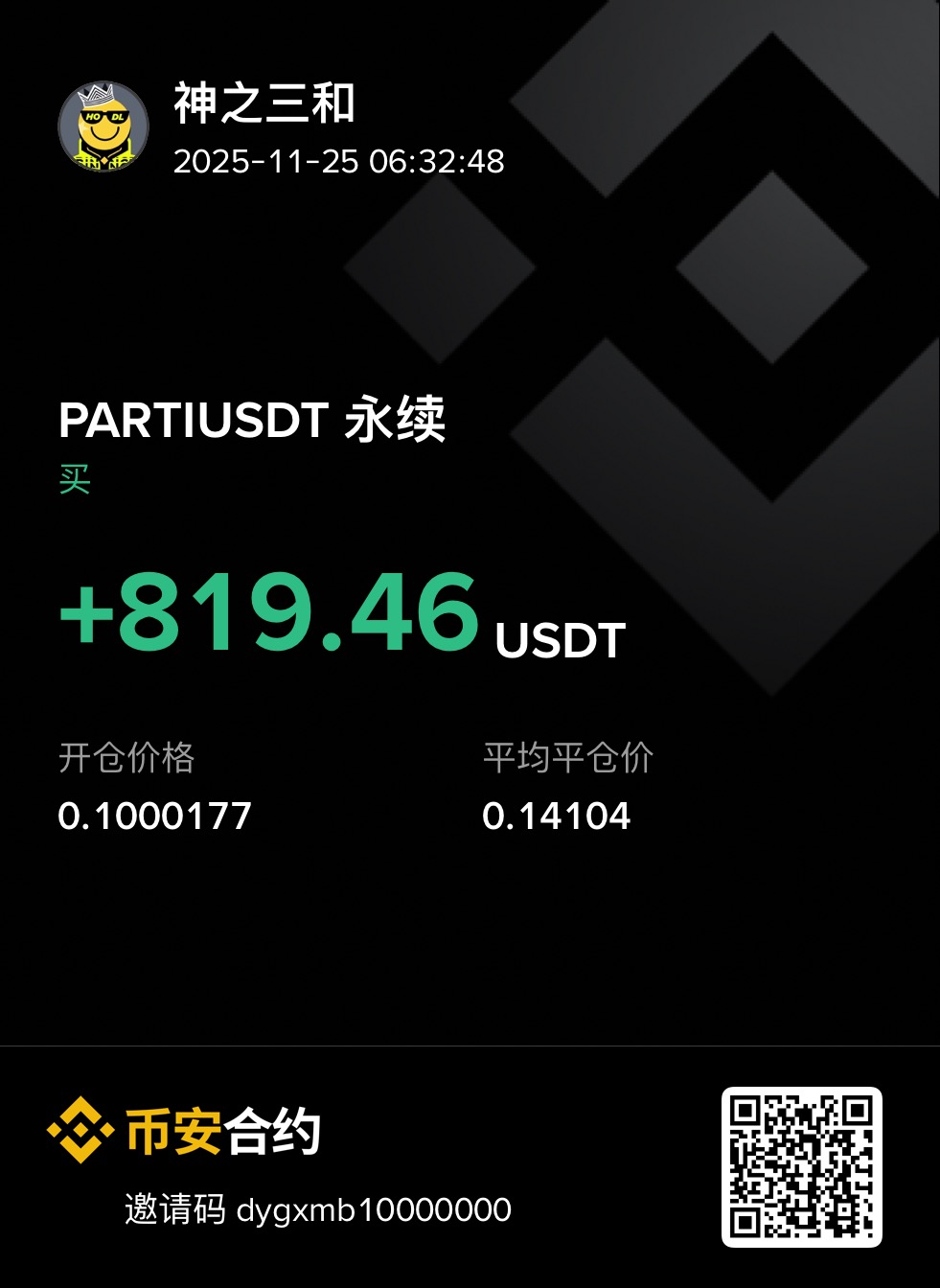 第六单是做多PARTI,这单还是粉丝群的一个粉丝被套牢了问我这个代币我去查,和研究了下,这不我的第六单就有了