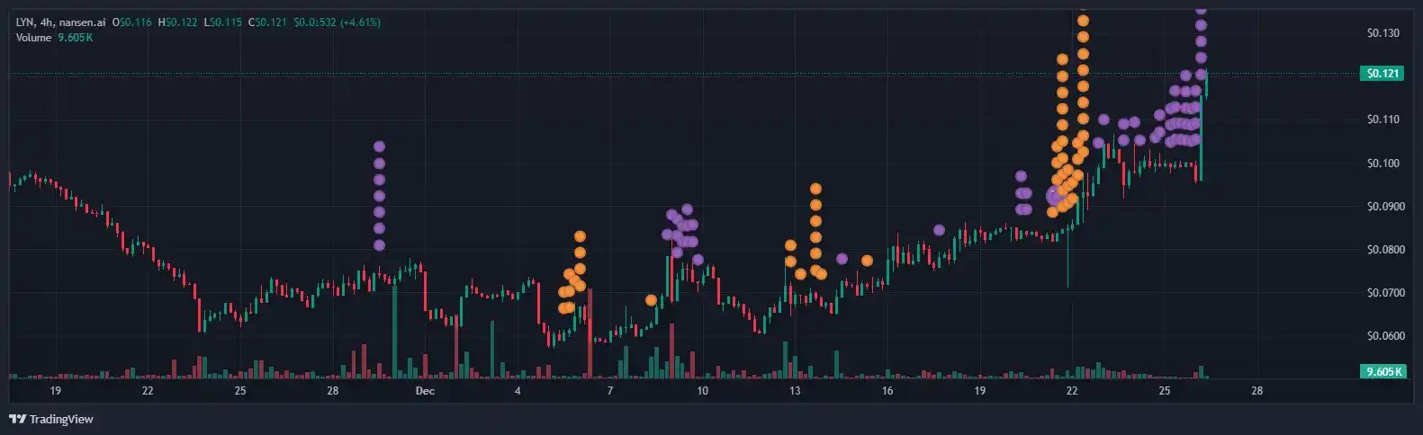 LYN | 庄家的老鼠仓是0.075左右,我查询了他过去链上记录,老鼠仓差不多有300多万刀现货,全部是用小额 去拉升币价,在2025年12月的时候开始建仓 目前已经破位,根据庄家资金以及换手操作来看可以去判断本次高位可能处于0.32-0.35区间 |